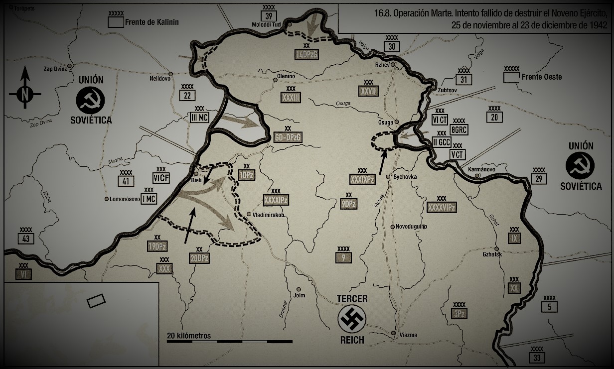 Será en los últimos meses de 1942 cuando, mediante la operación Marte, se produzca el intento más serio. Dos titánicas voluntades se enfrentaron cara a cara: por un lado Zhukov, el ojo derecho de Stalin, por el otro Model, el bombero del Reich.